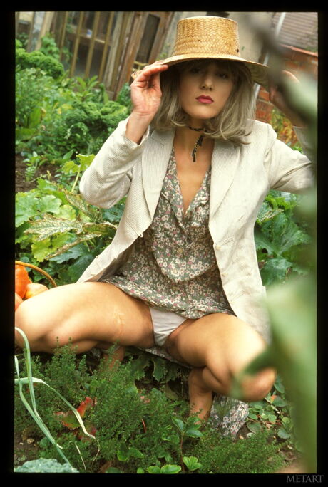 Blonde teen Jackie C gets naked in a field of hay while wearing a sun hat