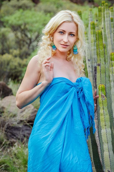 Blonde teen Janelle B removes a wrap to pose nude upon a boulder