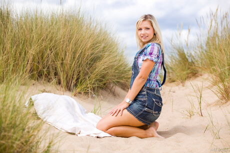 Blonde teen Jenni A gets naked on a beach confidently