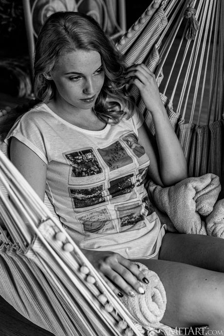 Blonde teen Lana Blue removes a shirt before showing her tight slit in a hammock
