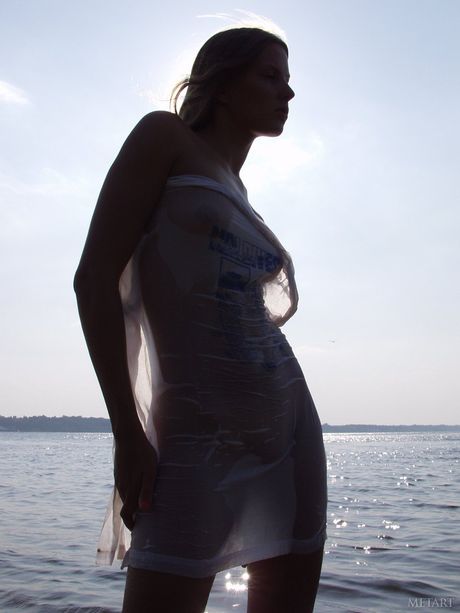 Blonde teen Models No Name gets naked in a shallow pool of water