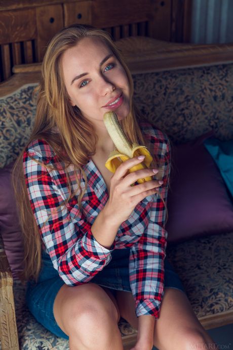 Blonde teen Ryana bares it all while eating a banana on a couch