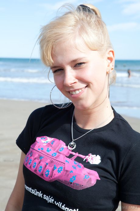 Blonde teen Tracy A removes her bikini and poses nude on the beach