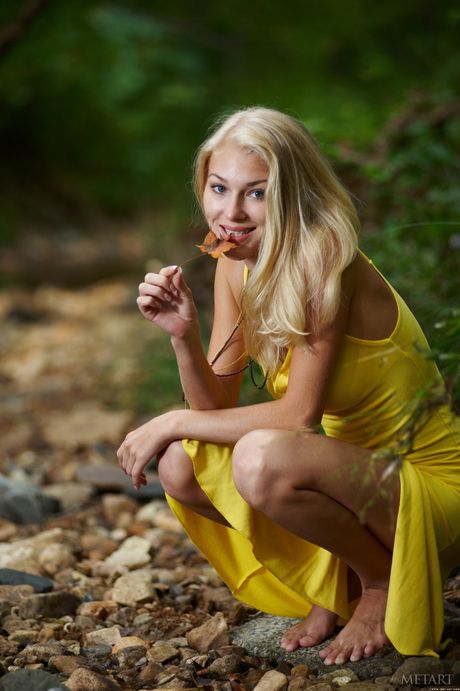 Blonde teen Veta A removes her dress to pose nude fearlessly