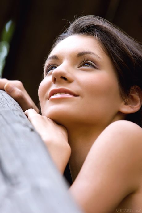 Brunette babe Leila A unveiling big teen tits and bald cunt outdoors
