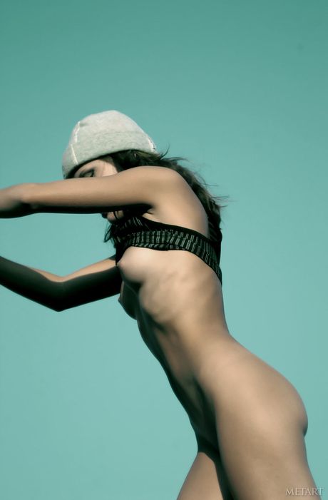 Brunette babe Liliane A flaunting her big tits and bald pussy outdoors