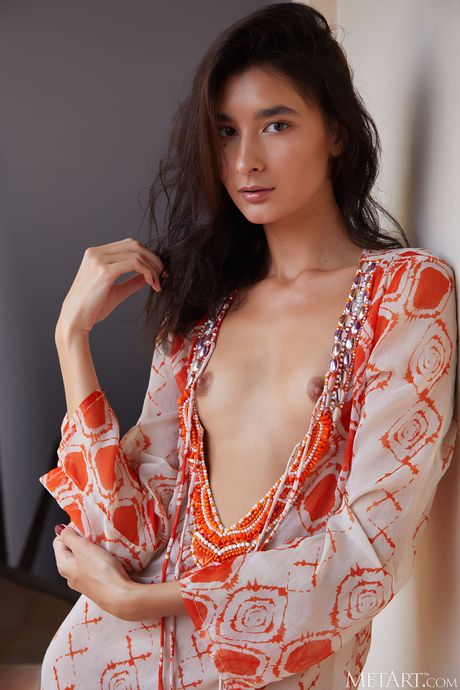 Brunette teen Bambi Joli removes a beaded dress to pose nude