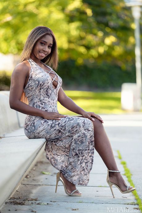 Brunette teen Boni Brown removes a bikini to pose nude in a public place