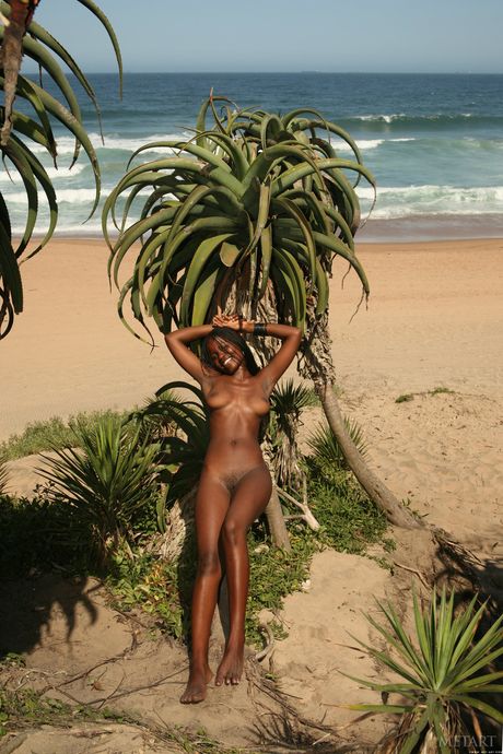 Brunette teen Malibu A gets naked in the shade of a palm tree