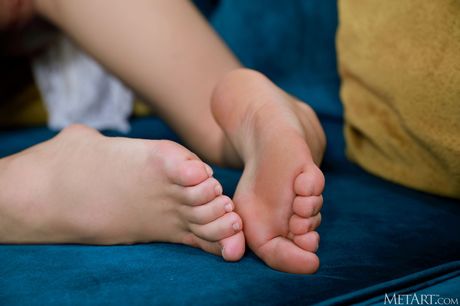 Charming teen Alina Petite gets completely naked on a sofa without shyness