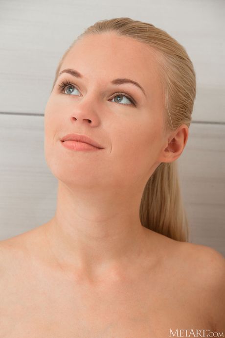 Charming teen Xena removes her hair from a ponytail before getting in a bathtub