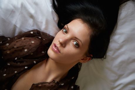 Delicate teen Anie Darling removes a sheer top to pose nude on her bed