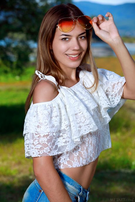 Delicate teen Maddison gets naked on a blanket in the middle of a field