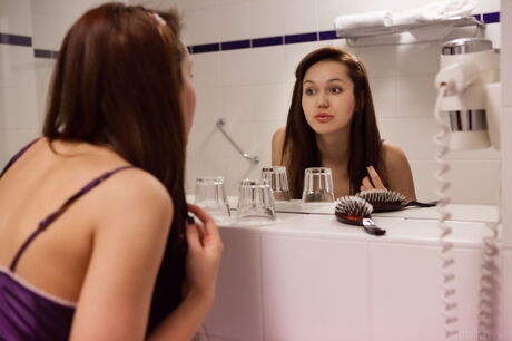 Delightful teen Sintia removes her lingerie to pose nude without hesitation