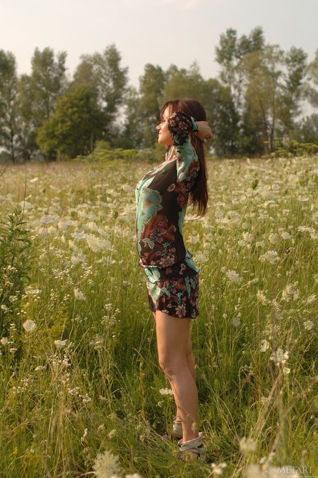 Desirable teen Ksena A strips naked in a field & shows her big tits & bald pussy