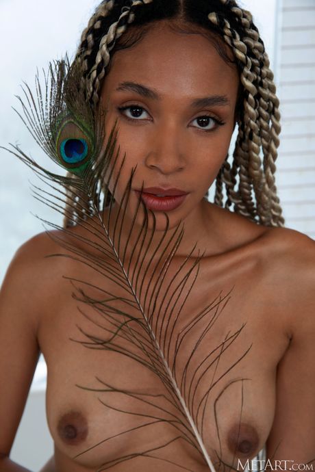 Ebony teen Aly Deity removes her pigtails and lingerie to pose nude