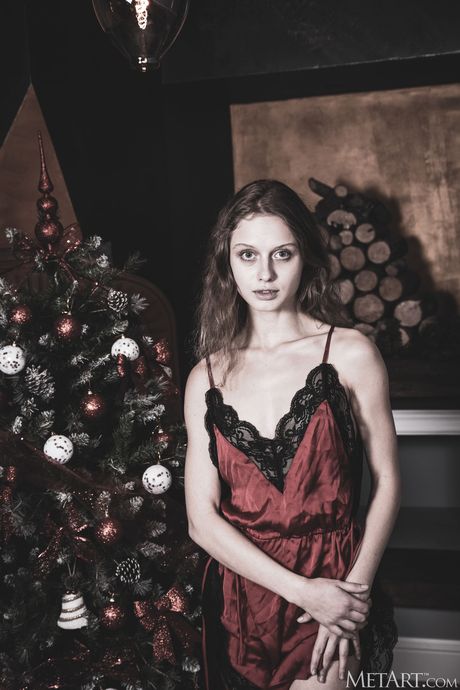 Endearing teen Clarice gets naked in red stockings and a Santa hat by a fire
