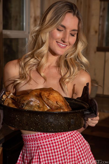 Engaging teen Chontelle goes naked in a kitchen while wearing a chefs hat