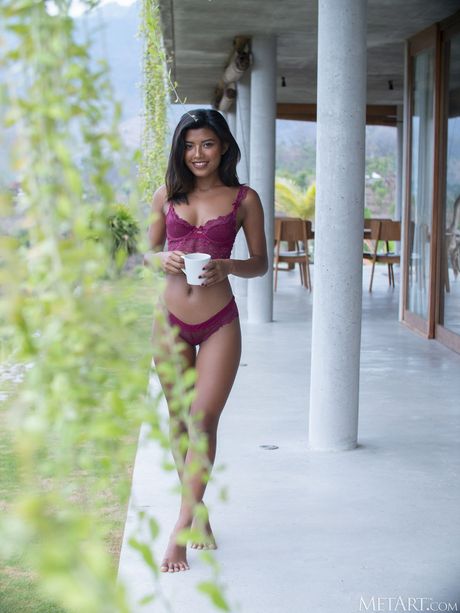 Engaging teen Moana Rosi gets naked on a terrace while sipping tea