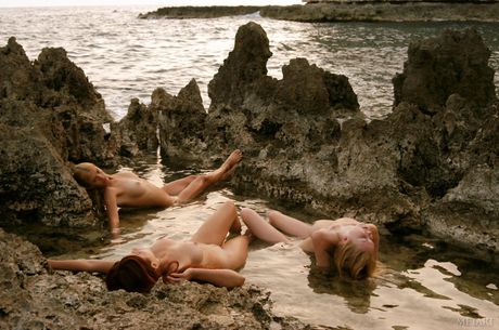 Engaging teens Chloe B, Nikita B & Ulya F pose nude on a beach at night