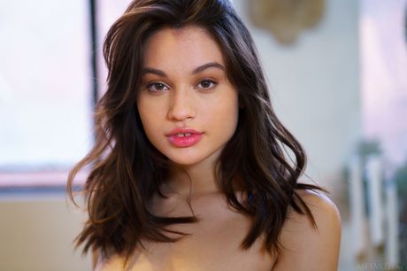 Flexible teen Liv Wild removes a dress and heels to get bare naked on a table