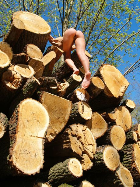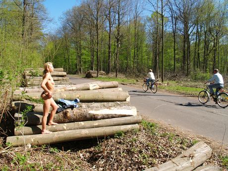 German teen Evi B removes her lingerie and boots to pose nude in public