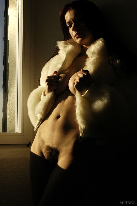 German teen Kyra demonstrates her big tits and hairy pussy in the nude
