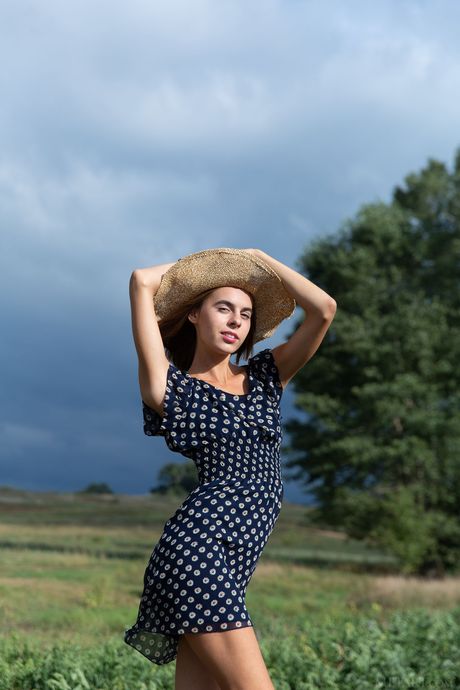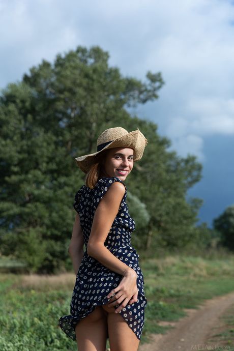 Gorgeous teen Gracie strips naked in a field and shows her big tits & bald pussy