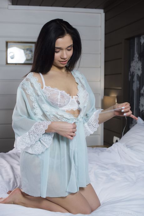 Hot teen Eselda removes her lingerie and panties to pose nude on her bed