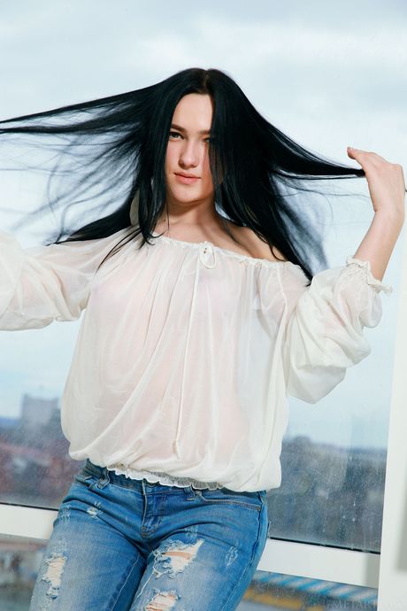 Hot teen Indiana Blanc gets naked in high heels while looking out the window