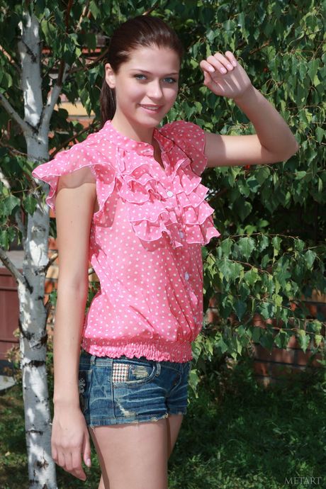 Hot teen Liza J strips naked & poses on a ladder in the forest