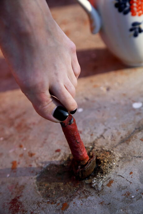 Indiana A pours water over her naked body in a backyard