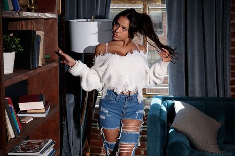 Latina babe Autumn Falls strips and shows her big tits and sexy ass