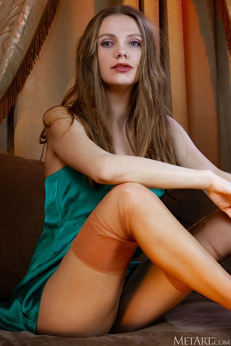 Lean teen Elina De Leon removes her lingerie and stockings to get naked