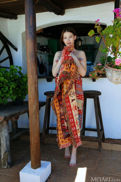Lean teen Stasey demonstrates her small tits & her sweet pussy on the patio