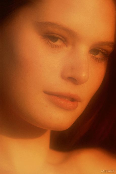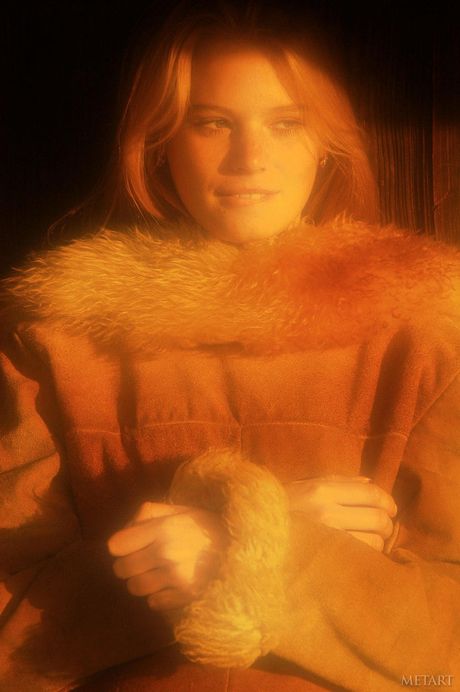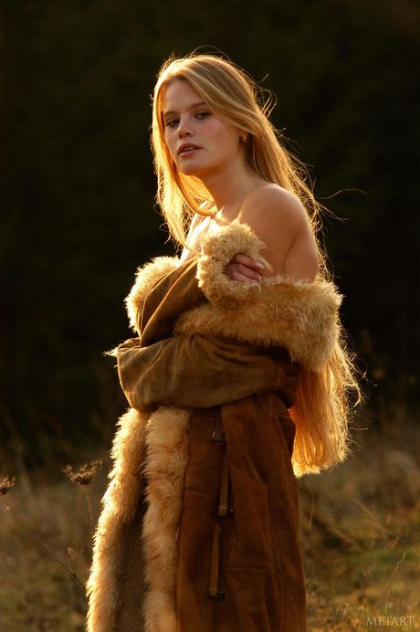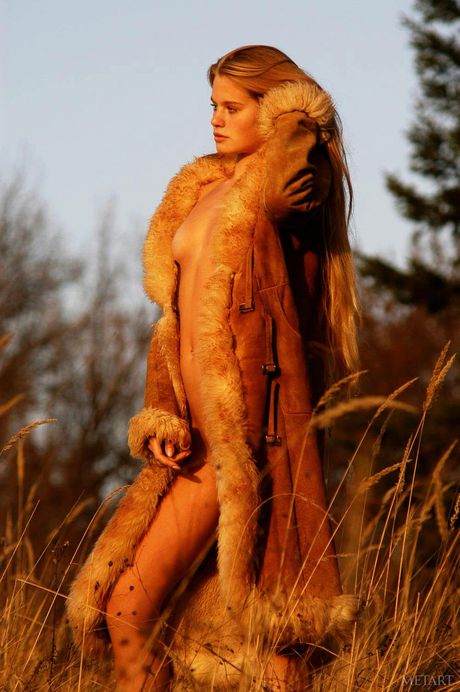 Ligh-haired teen Andrea C poses nude in a fur coat and heels on a lawn