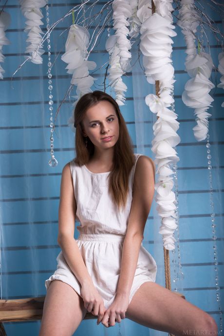 Lovely teen Gracie removes a white dress to get naked on a swing