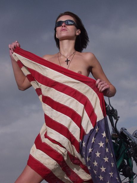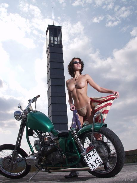 Lovely teen Models No Name strips naked on a motorcycle in a backyard