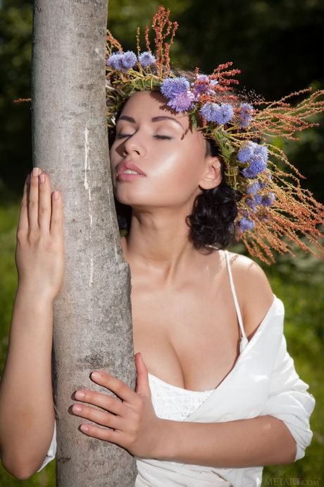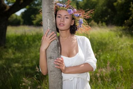 Lovely teen Pammie Lee shows her big tits and bald pussy in a field