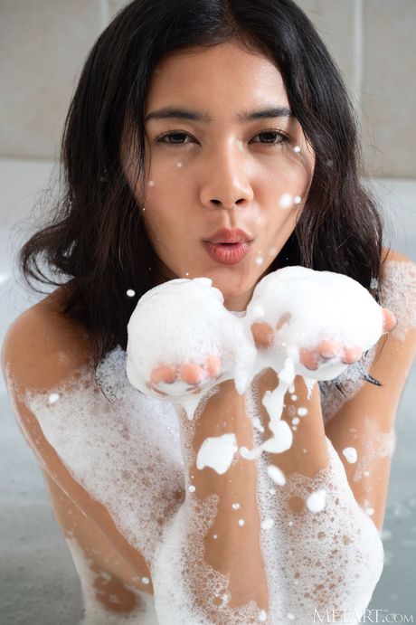 Lovely teen Yori removes a silk robe to get naked in a bathtub