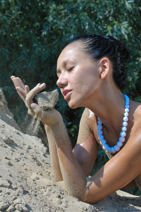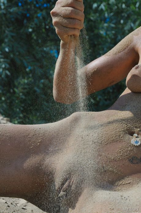 Magnetic teen Diva A displays her big tits and poses naked in a sandy area