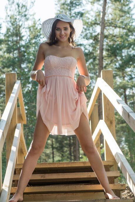 Magnetic teen Oxana Chic bares her body on a set of stairs in a rural area