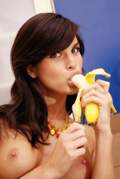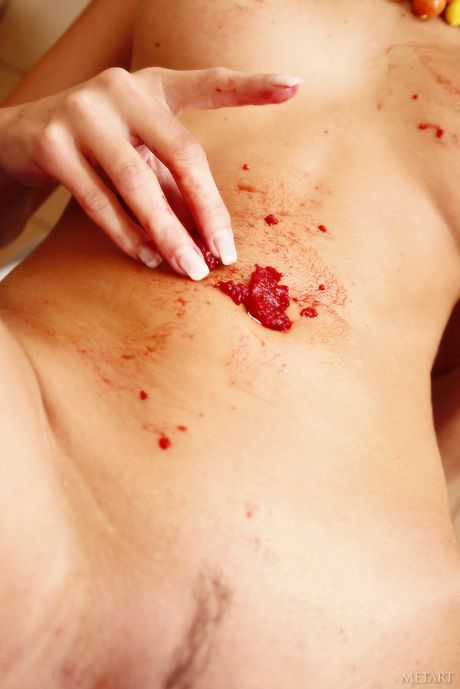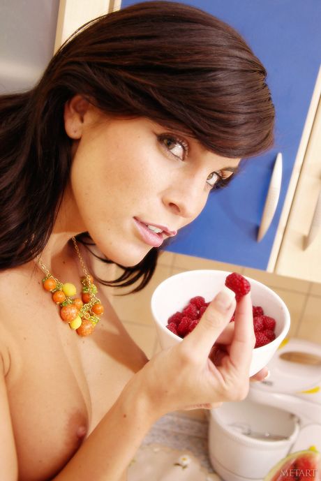 Naked teen Nella A presents her big tits and bald pussy in the kitchen