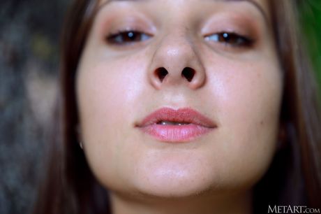 Nice teen Rosalina gets completely naked on a blanket near a river