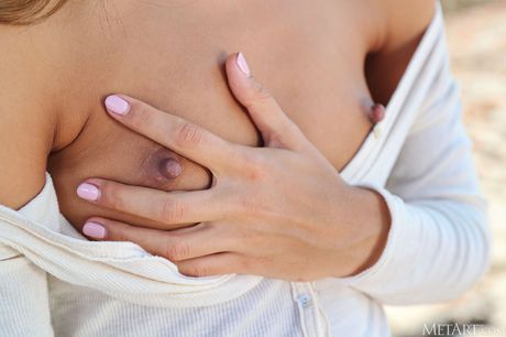 Petite teen Kenya gets completely naked on a blanket on a beach