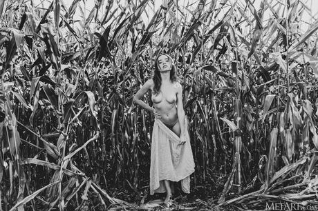 Petite teen Rinna Ly bares her body in a cornfield by herself