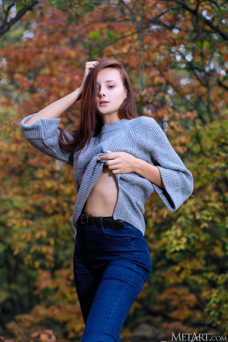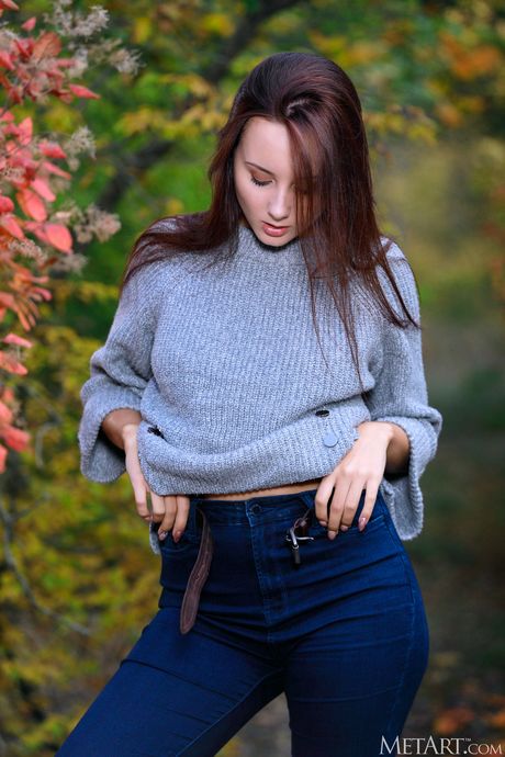Petite teen Rosalina goes nude in the forest & shows her small tits & bald pussy