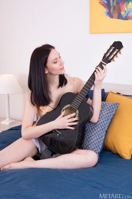 Petite teen Shirley Mae bares it all while playing a guitar on a bed