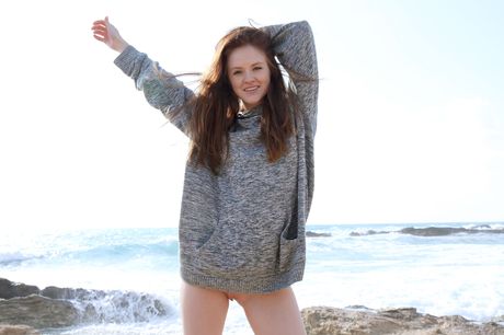 Pure teen Alice May removes a sweater to pose nude on a rocky beach