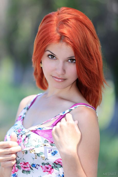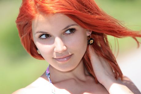 Redheaded babe Violla A strips her lingerie & reveals her big tits outdoors